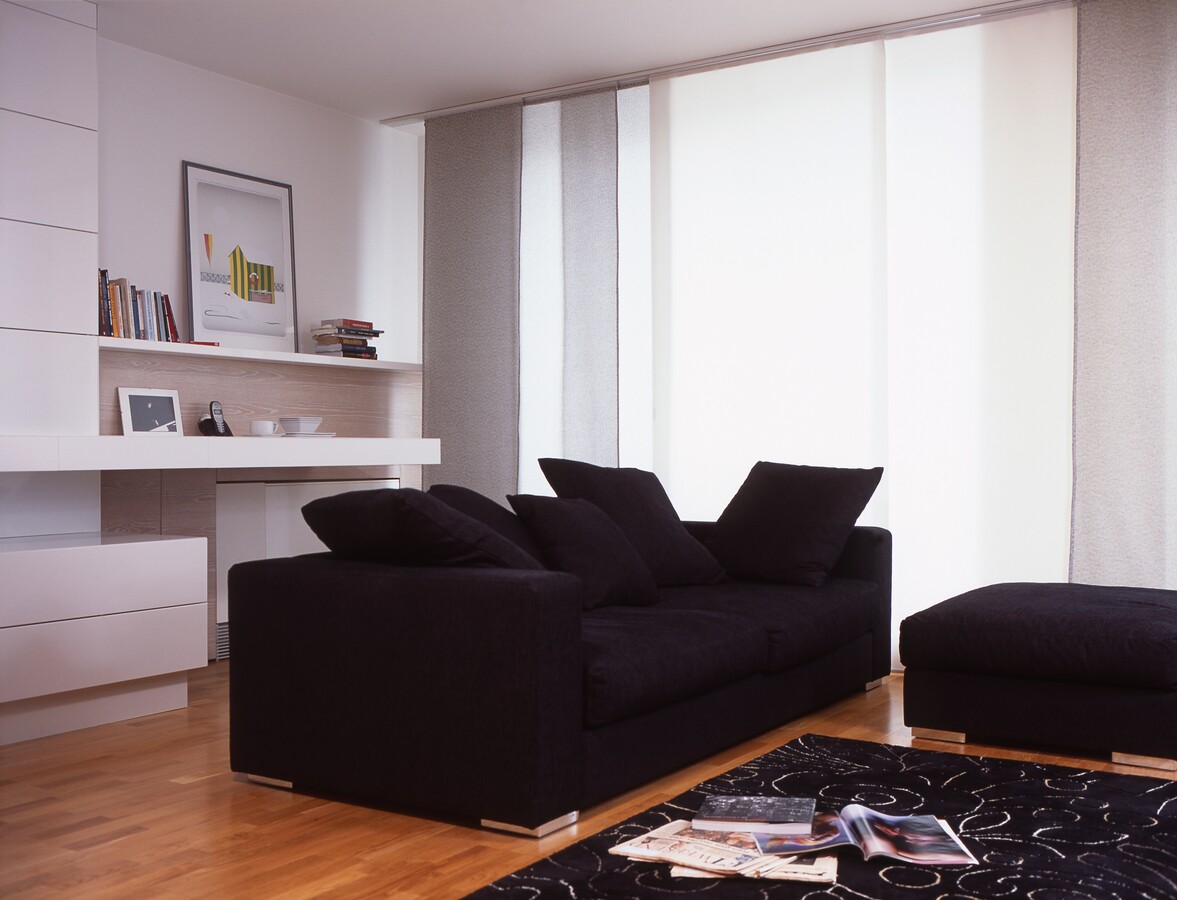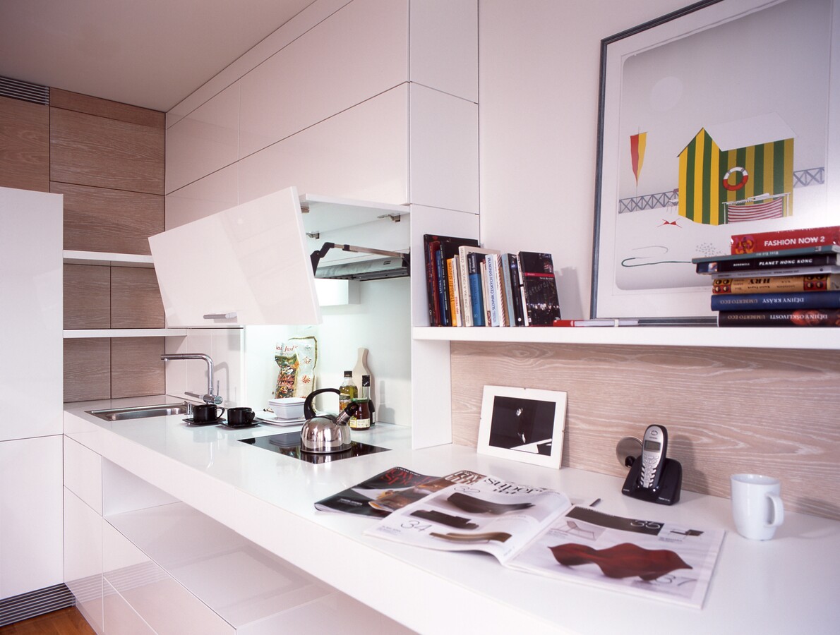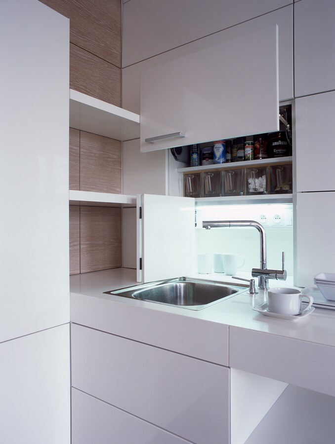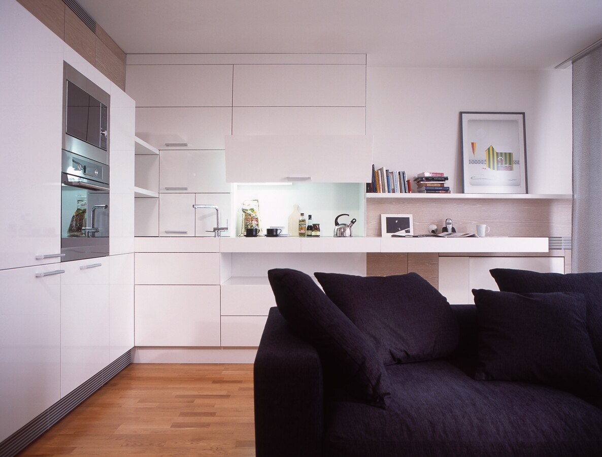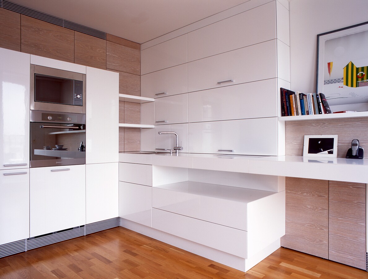 Bílé plochy ve vysokém lesku s bezúchytkovým otevíráním dvířek a zásuvek.